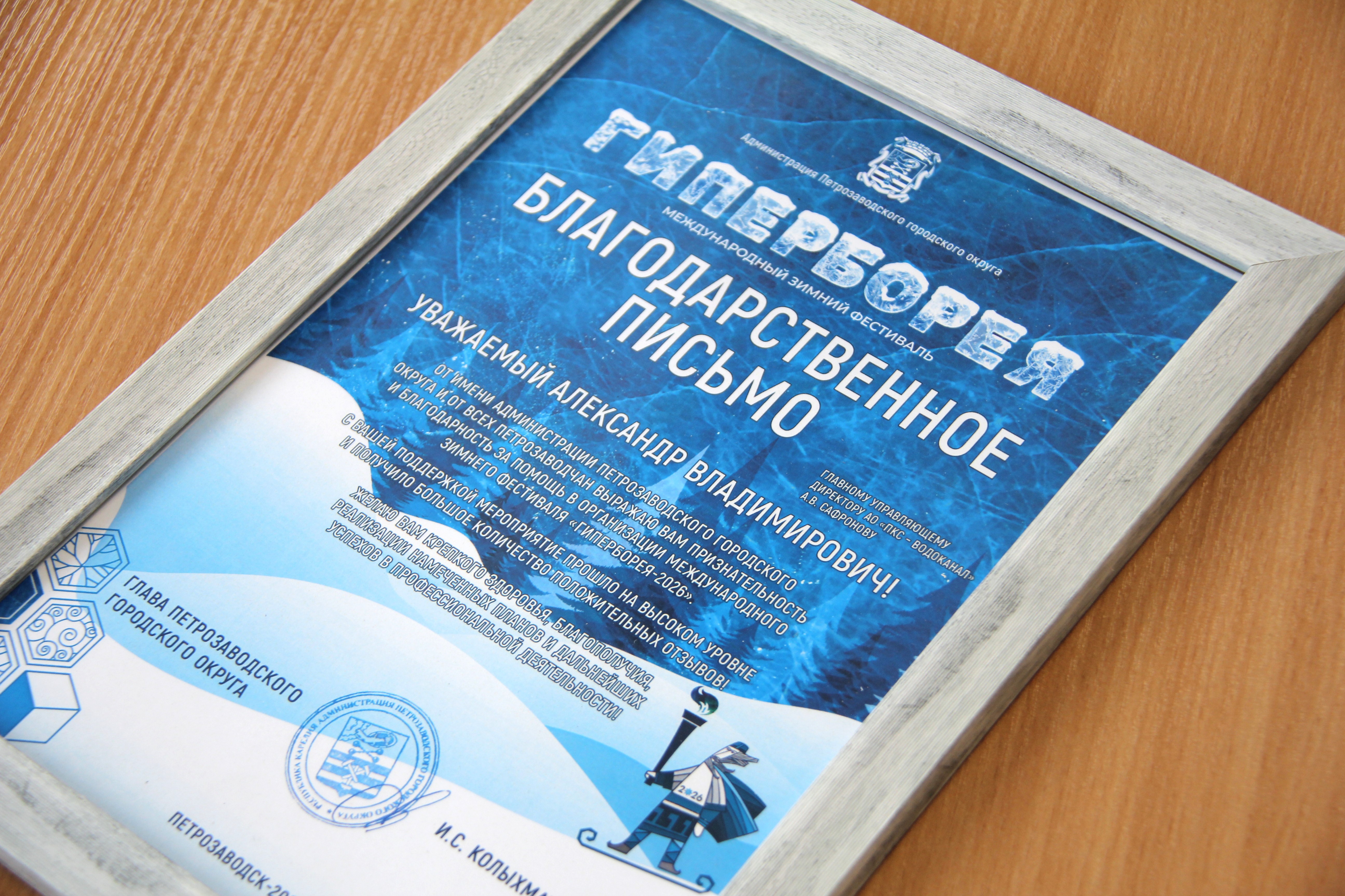 «РКС – Петрозаводск» получили благодарность от Главы Петрозаводского городского округа Инны Колыхматовой за помощь в организации международного фестиваля «Гиперборея – 2026»